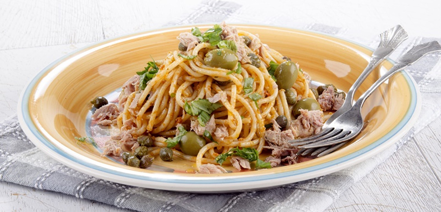 Ingredienti 400g di spaghetti 300 g di tonno in scatola ASdoMAR 20 olive 10 -15 capperi 1 cipolla olio evo sale Per la ricetta abbiamo utilizzato